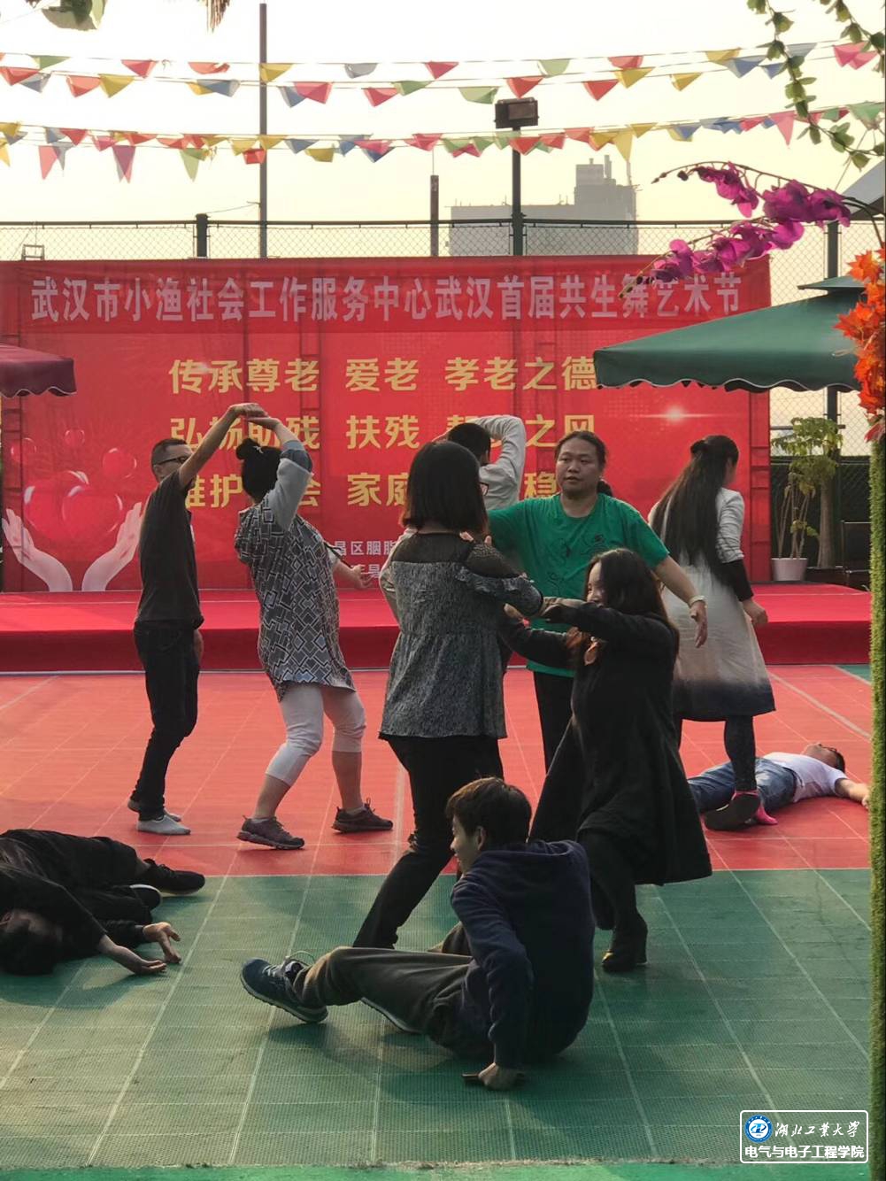 中午12时,志愿者们按要求在武昌区民福老年病医院门口集合。等待小渔老师的到来后,便到顶楼布置会场。悬挂横幅、支起遮阳伞、准备食品与热水、摆放桌椅板凳等前期准备工作,在志愿者齐心协力下有条不紊地进行着。临近活动开始,各岗位志愿者到各自的工作地点准备就绪。迎宾岗的两位志愿者在一楼电梯口前迎接每位来宾的到来,春天般温暖的笑容打消了不确定者的顾虑、消融了残障人士的羞涩。楼道的男孩子们齐心协力将轮椅患者抬上楼、将行动不便的来宾扶入会场。确保每位来宾的人身安全是我们志愿者的责任和义务,提供舒适便捷的环境是我们志愿者致力的追求。
