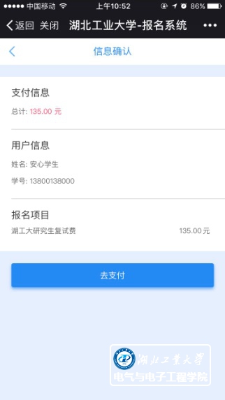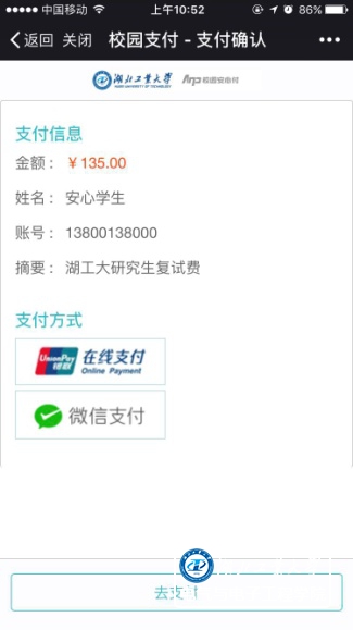 Step2:进入信息确认界面后,确认支付金额及个人信息无误后点击去支付,选择支付方式:微信支付或者银联在线支付(推荐使用微信支付)。