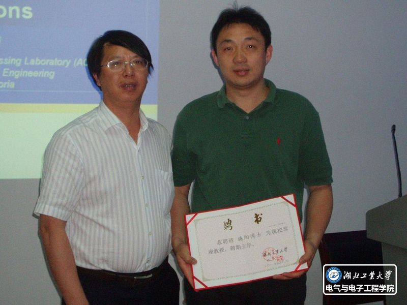 5月12日,施阳博士客座教授受聘仪式在电气与电子工程学院举行。副校长李冬生为来自加拿大维多利亚大学的终身副教授施阳博士颁发湖北工业大学客座教授授聘证书。人事处肖志玲处长、电气与电子工程学院全体领导班子出席授聘仪式。